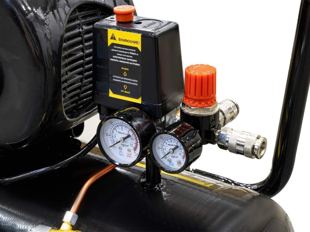 Компрессор оснащен регулятором рабочего давления и манометром. Для защиты от попадания пыли и грязи предусмотрен защитный пластиковый кожух электродвигателя.